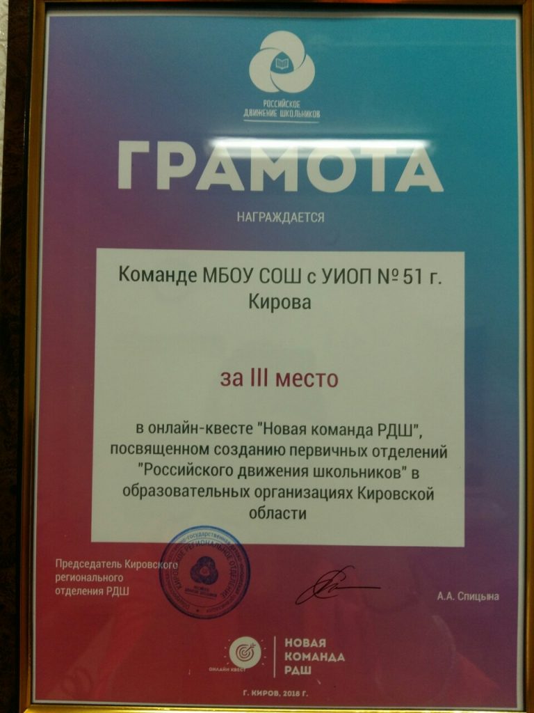 28 декабря 2018 г прошел новогодний праздник «Новый год с РДШ». Ребята из разных школ поздравили друг друга яркими выступлениями, погрузились в новогоднюю атмосферу. А самое главное- были подведены результаты онлайн-квеста «Новая команда РДШ». Квест длился 4 месяца, было выполнено много заданий. В квесте принимало участие 38 команд образовательных учреждений Кировской области. Команда нашей школа заняла 3 почетное место!