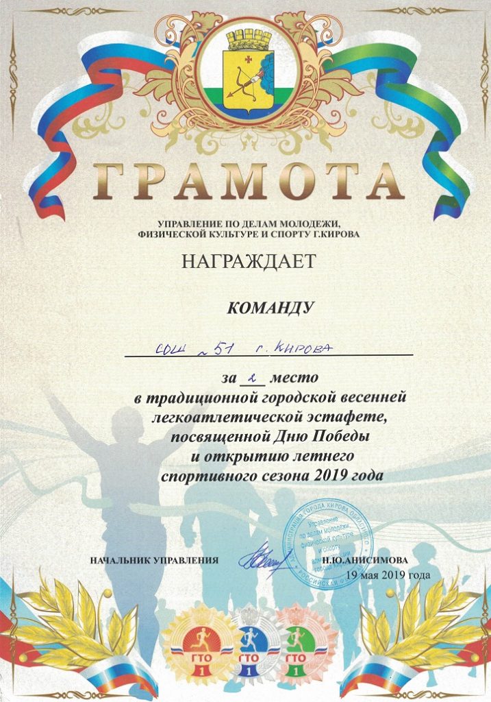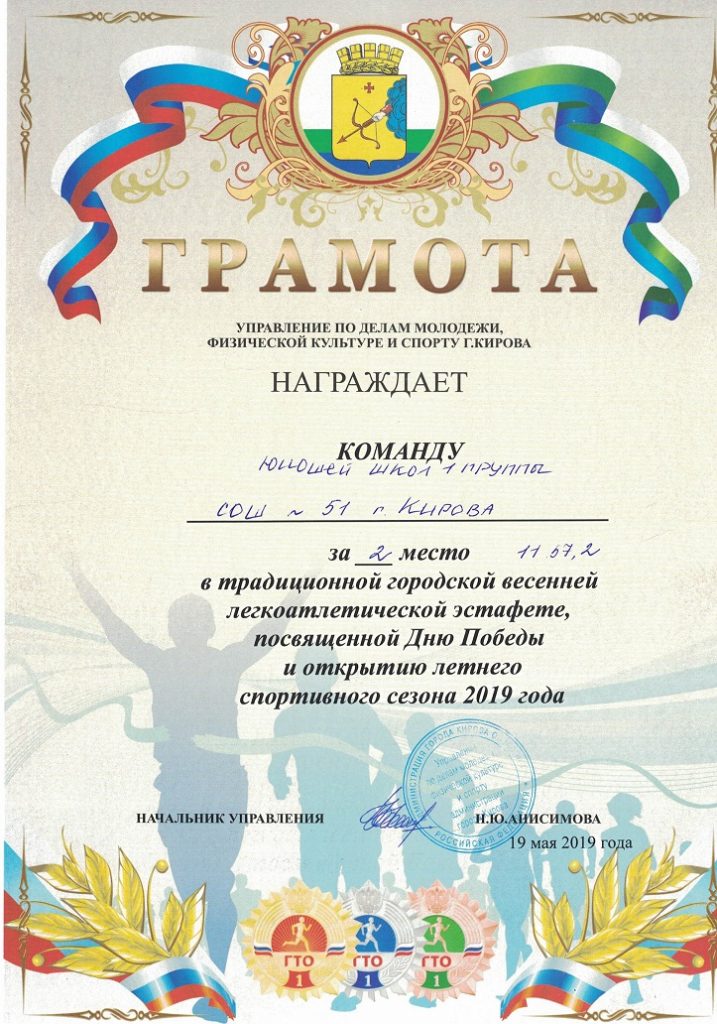 19 мая 2019 года команда школы в составе 59 учеников принимала участие в традиционной городской весенней легкоатлетической эстафете, посвященной Дню Победы и открытию летнего спортивного сезона 2019 года. Команда школы заняла 2 место! Поздравляем наших сортсменов!