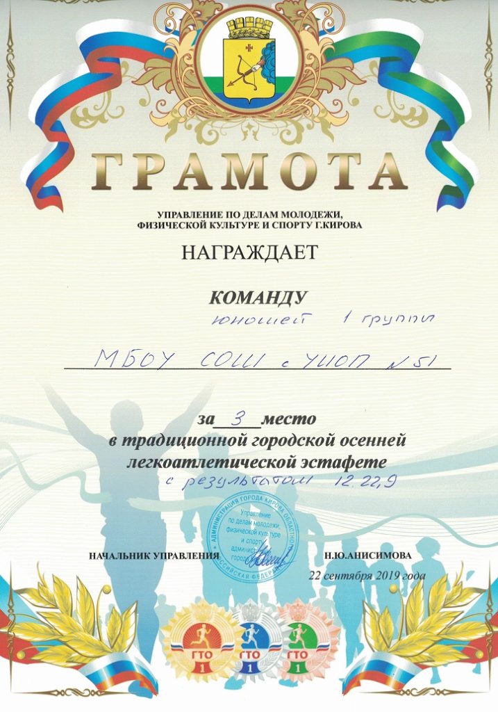 22 сентября 2019 года команды учеников нашей школы приняли участие в традиционной городской осенней легкоатлетической эстафете учащихся образовательных учреждений города Кирова. Результат — 3 место команды девушек и 3 место команды юношей. Поздравляем!