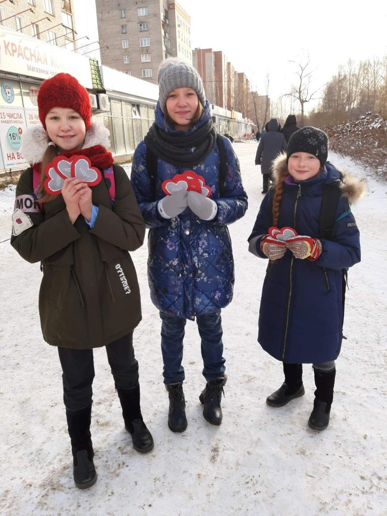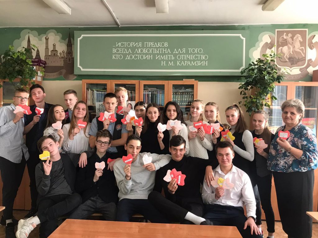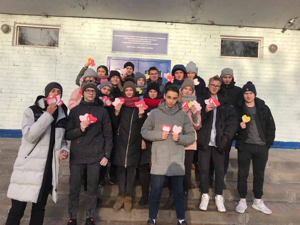В последнее воскресение ноября, 24 ноября, в России отмечали Международный день матери. Ученики 5А, 8Б, 10Б, 10В и 11Б приняли участие в социальной акции «Обними маму!», которую организовало территориальное управление администрации г. Кирова по Ленинскому району. Ребята изготовили двухсторонние сердечки с напоминанием о празднике и предложением «Обними маму!», а затем раздали несколько сотен таких открыток горожанам.