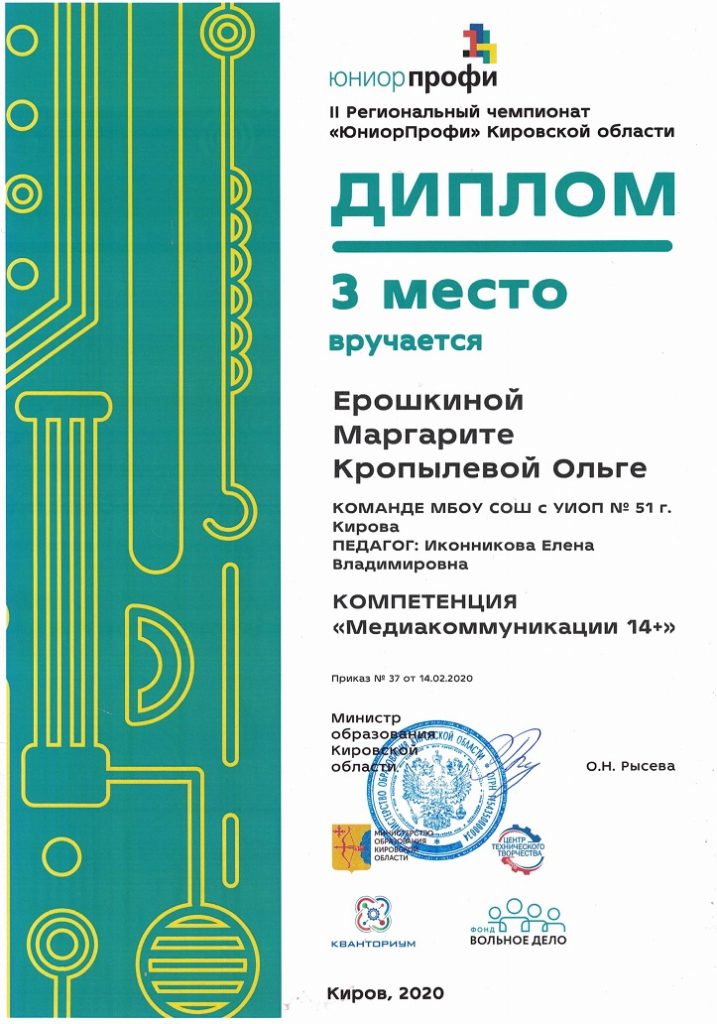 Цель чемпионата — подготовка кадров в соответствии с мировыми стандартами при учете новых высокотехнологичных производств. Молодые профессионалы соревнуются по шести разным специальностям, таким, как пром. дизайн, прототипирование, робототехника — техническим специальностям, которые стереотипно считаются непрестижными или лишенными творческого начала. JuniorSkills — возможность разрушить стереотипы, научиться чему-то новому и, главное, показать себя. Команда 51 школы заняла 3 место по компетенции «Медийная журналистика». Задачей команды было освещение чемпионата электронщиков, создание медиапродукта и его продвижение.