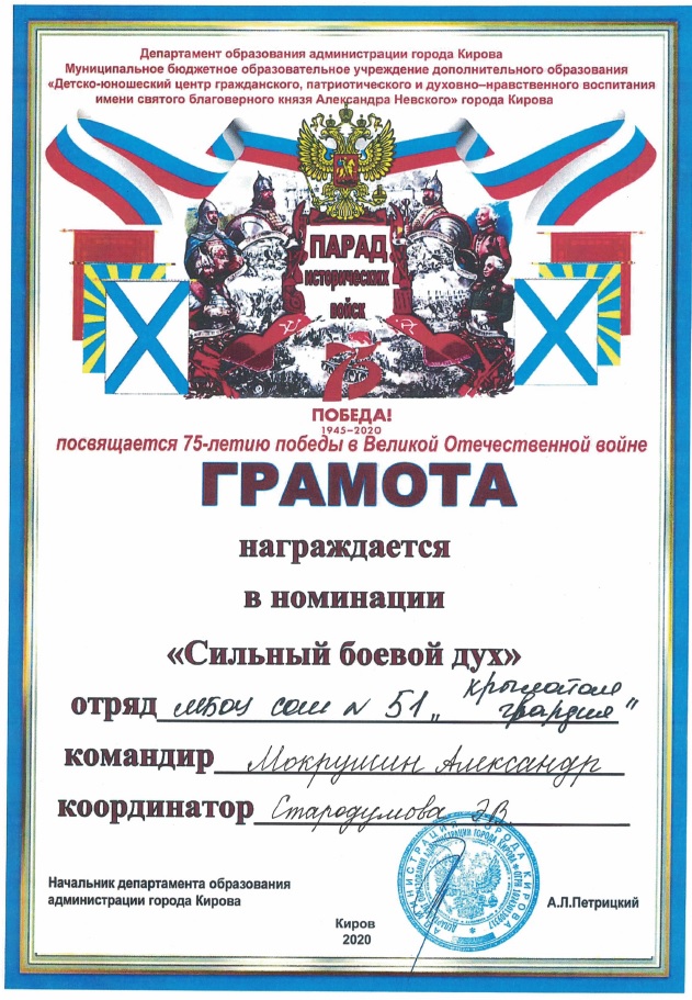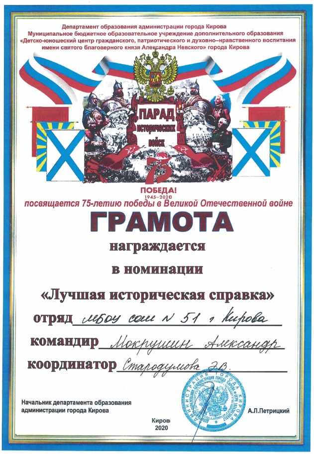 Команда 3 А класса МБОУ СОШ с УИОП № 51 г. Кирова участвовала в параде и получила грамоты в двух номинациях: «Сильный боевой дух», «Лучшая историческая справка»