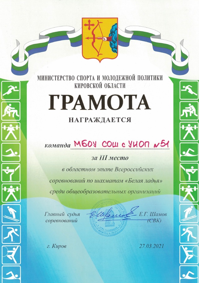 приняла участие в областном этапе Всероссийских соревнований по шахматам «Белая ладья» среди команд общеобразовательных организаций Кировской области.