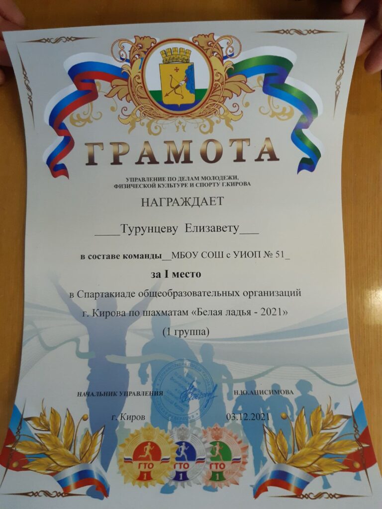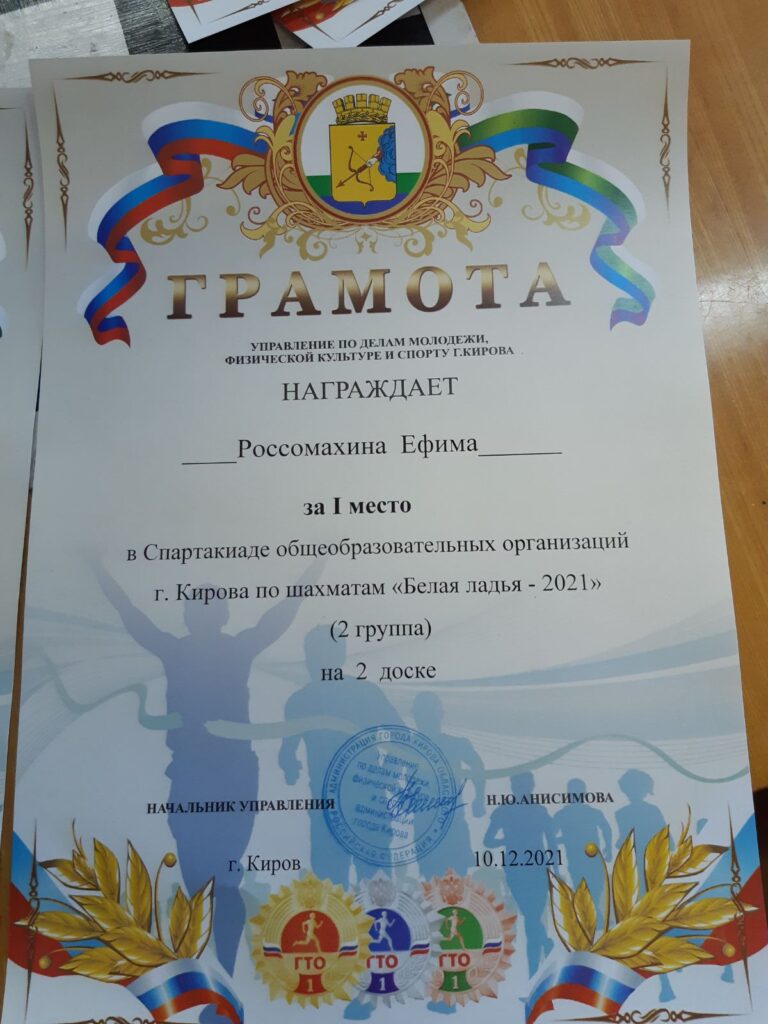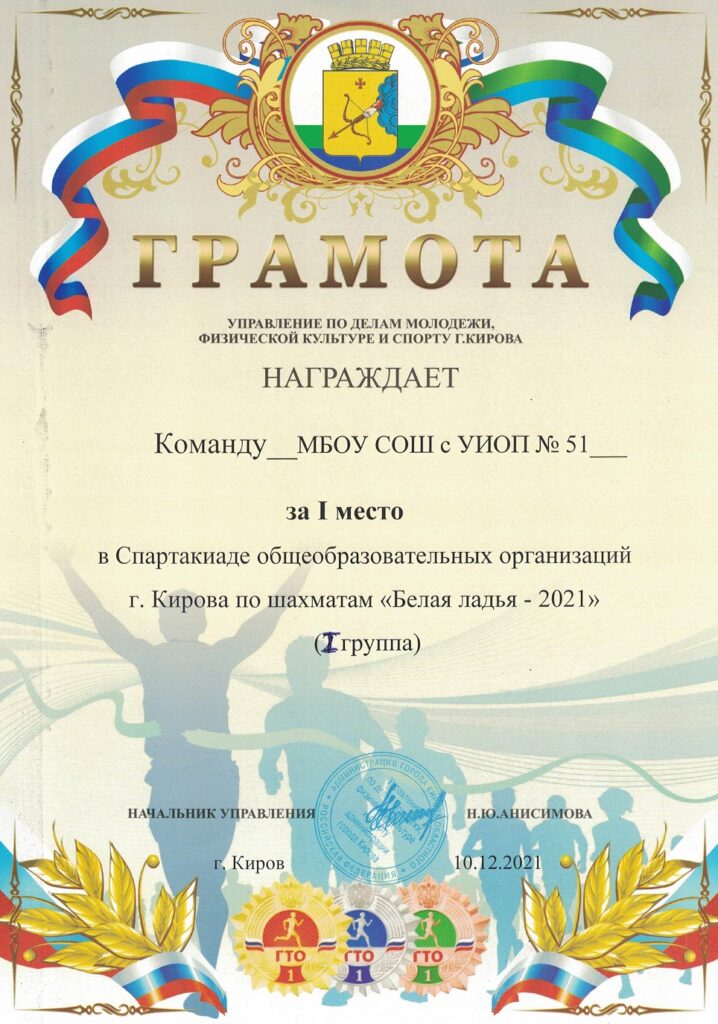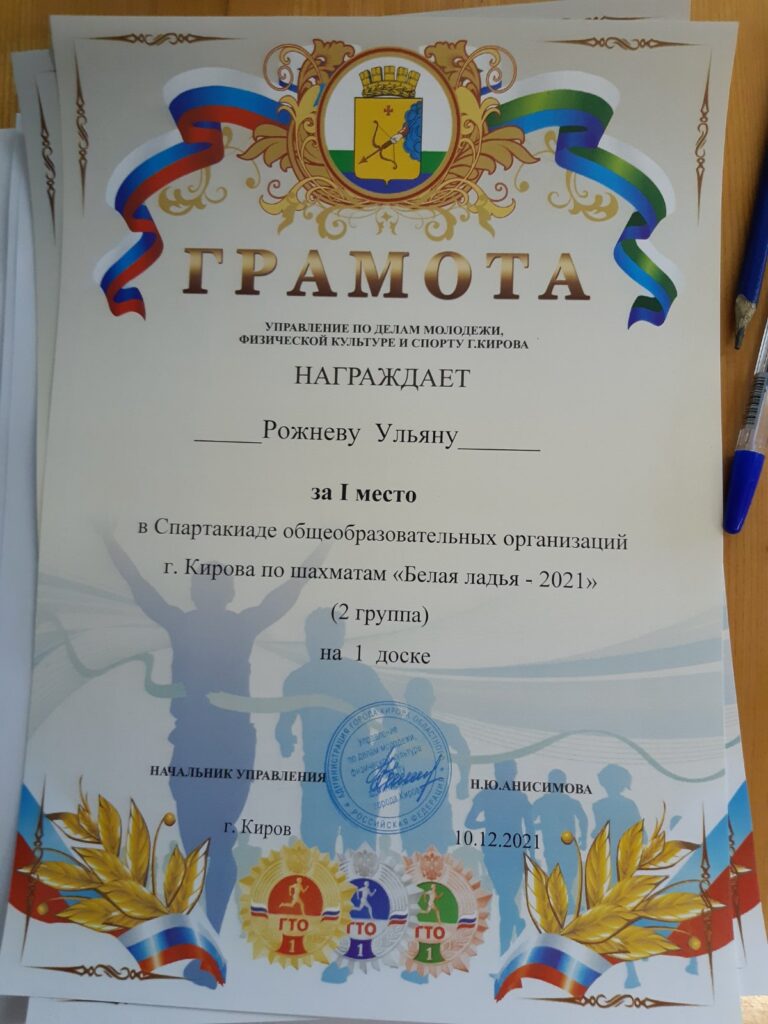 С 8 по 10 декабря 2021 года команда учеников нашей школы принимала участие в Спартакиаде общеобразовательных организаций города Кирова по шахматам «Белая ладья-2021».