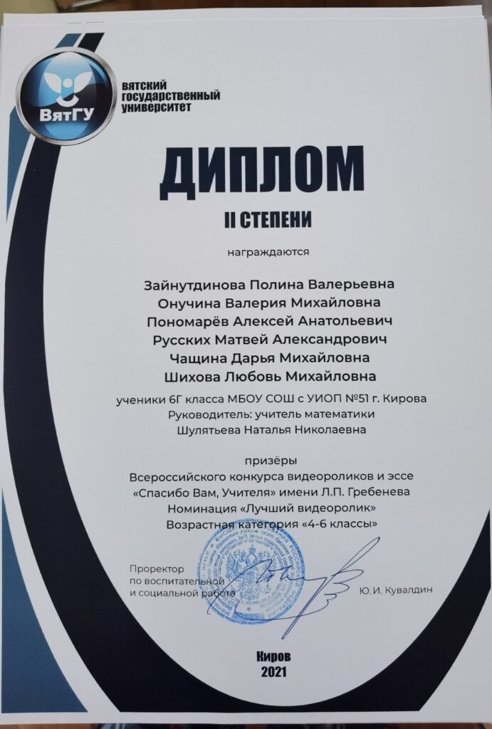 Конкурс видеороликов 15.12.2021 В октябре 2021 года ученики 6Г класса приняли участие в I Всероссийском конкурсе видеороликов и эссе имени Л.П. Гребнева «Спасибо вам, учителя!». Результат участия — 2 место в номинации «Лучший видеоролик» в возрастной категории «4-6 классы».