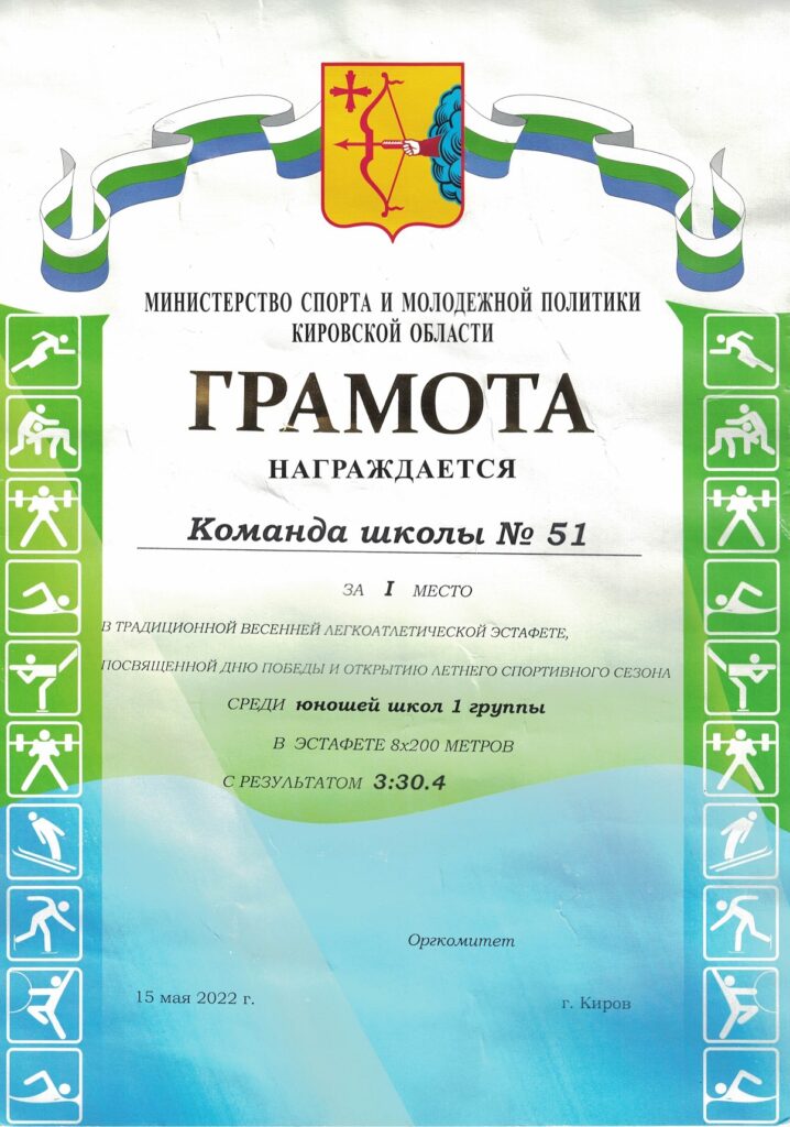 Участие в эстафете 17.05.2022 15 мая 2022 года команда учеников 7-11 классов школы приняла участие в соревнованиях «Спортивная весна». Команда юношей заняла 1 место в традиционной весенней легкоатлетической эстафете.