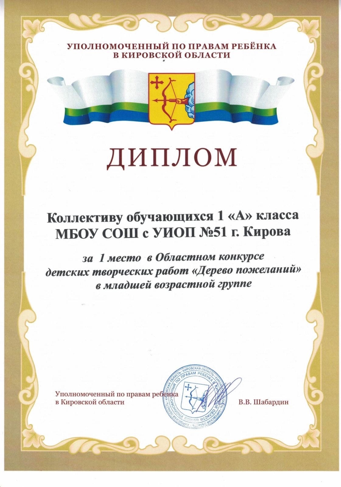 С 14 сентября по 15 октября проводился областной конкурс детских творческих работ «Дерево Пожеланий», организованный Уполномоченным по правам ребенка в Кировской области и Детским общественным советом при Уполномоченном по правам ребенка в Кировской области в честь Международного Дня учителя. Конкурс проводился в целях формирования у обучающихся уважительного отношения к труду педагога, развития творческого потенциала обучающихся, сплочения детей в классах и укрепления взаимоотношений с учителями. Наши первоклассники из 1А с удовольствием поучаствовали в данном конкурсе. Они подготовили коллективную творческую работу и стали победителями в младшей возрастной категории.