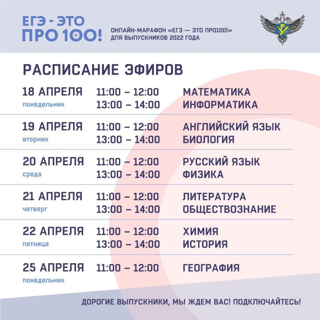 18 апреля стартует онлайн-марафон «ЕГЭ — это про100!» для выпускников 2022 года. Трансляции будут проходить в официальных аккаунтах Рособрнадзора: